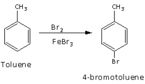 Now, toluene undergoes the electrophilic aromatic substitution and gives 4-bromotoluene and the reaction is as follows: