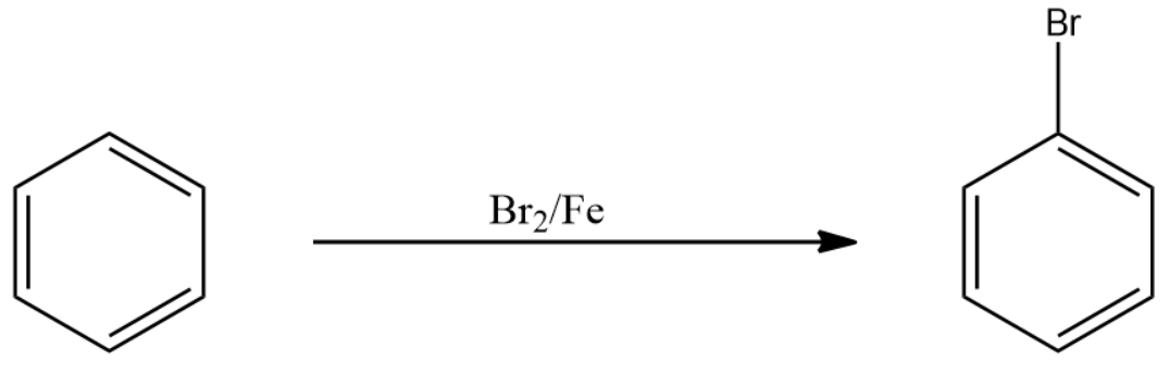 First of all, we need to convert the benzene into bromobenzene. This is an aromatic halogenation class of reactions under Electrophilic aromatic substitution reaction. For this, we react to bromine in the presence of iron with benzene to form bromobenzene.