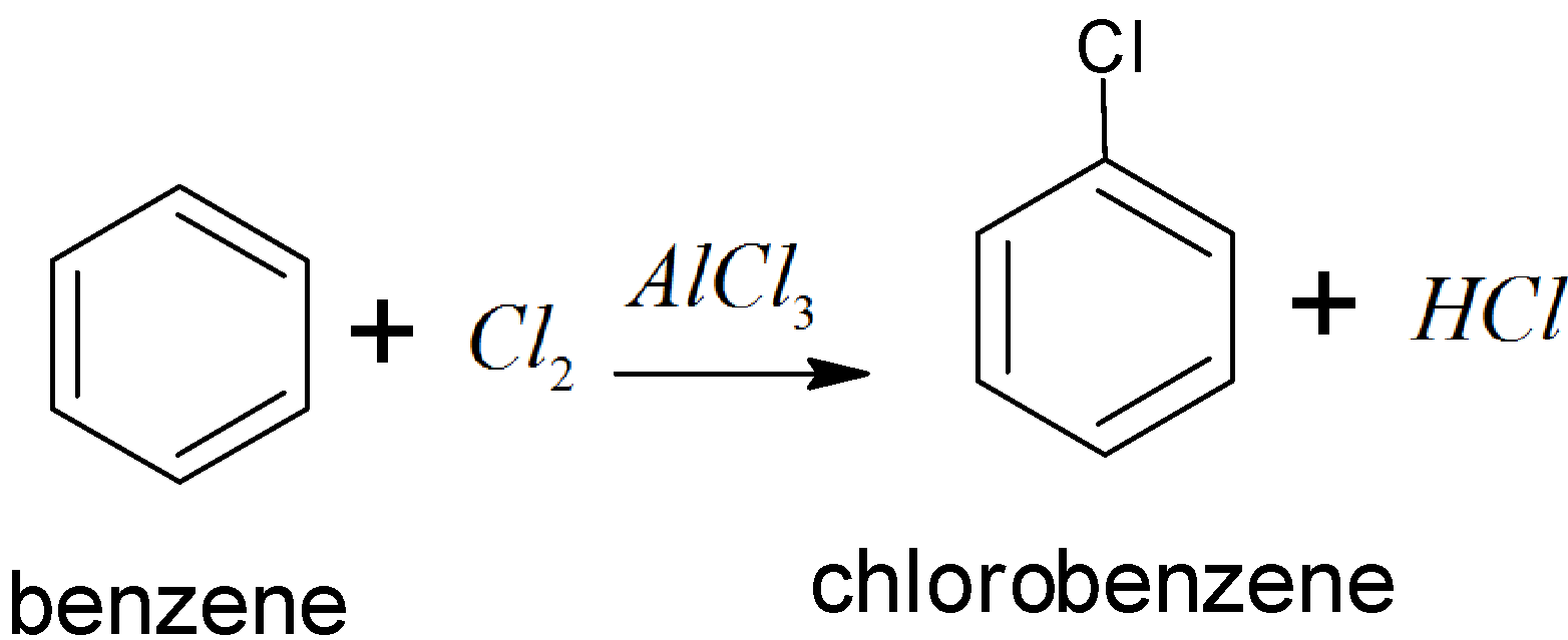 There are two steps we use here for this conversion, first is benzene to chlorobenzene and second chlorobenzene to biphenyl (as a final product or desired product). For the first conversion we take \[C{{l}_{2}}+AlC{{l}_{3}}\](anhydrous) and this is called a chlorination reaction. It is an electrophilic substitution. Here chlorination reaction of benzene is as follows: