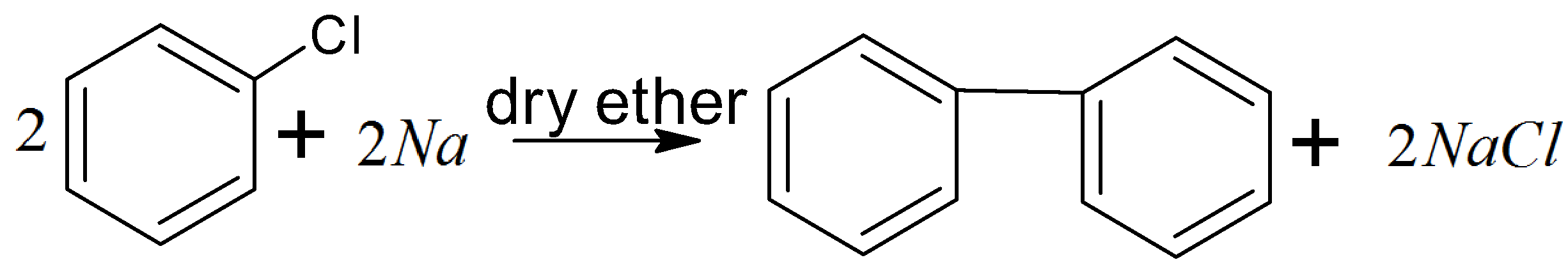Then in step two we have to convert chlorobenzene to biphenyl in the presence of sodium and dry ether. This reaction is known as the fitting reaction. And the reaction is as follows: