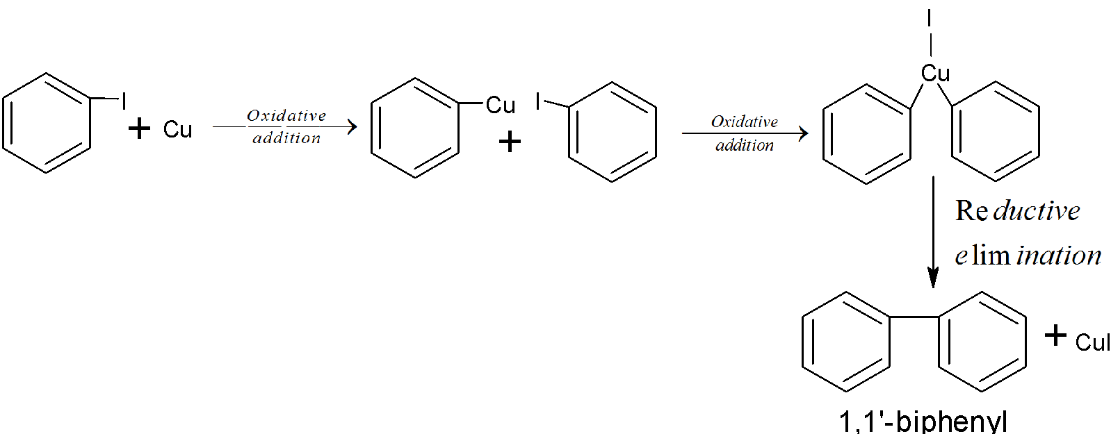 There is another method also like Ullmann’s reaction in which chlorobenzene is treated with Cu metal and then biphenyl is obtained. And the reaction mechanism is as follows: