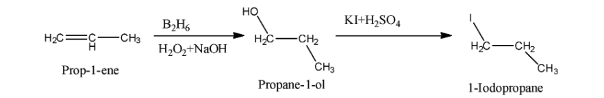 We know that Propene reacts with diborane and hydrogen peroxide in presence of sodium hydroxide and form propan -1-ol. This process is also called hydroboration oxidation. After formation of propane -1-ol, propane -1-ol reacts with potassium iodide in presence of sulfuric acid and form 1-iodopropane. The reaction of formation of 1-iodopropane is as follows: