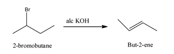 We know that 2-bromobutane reacts with alcoholic KOH and form but-2-ene. This reaction is also called dehydration reaction. The reaction for formation of but-2-ene is as follows: