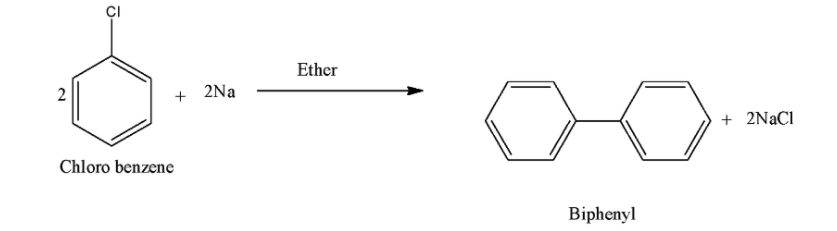 As we know we use Fittig reaction to convert chloro benzene to biphenyl. Two moles of sodium reacts with chlorobenzene in presence of ether and form biphenyl. The reaction for the formation of biphenyl from chloro benzene is as follows: