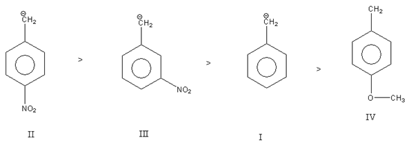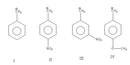 So, out of the given carbanion, carbanion IV is least stable as the electron-donating methoxy group ${\text{( - OC}}{{\text{H}}_{\text{3}}}{\text{)}}$present at para position decreases the stability of carbanion.