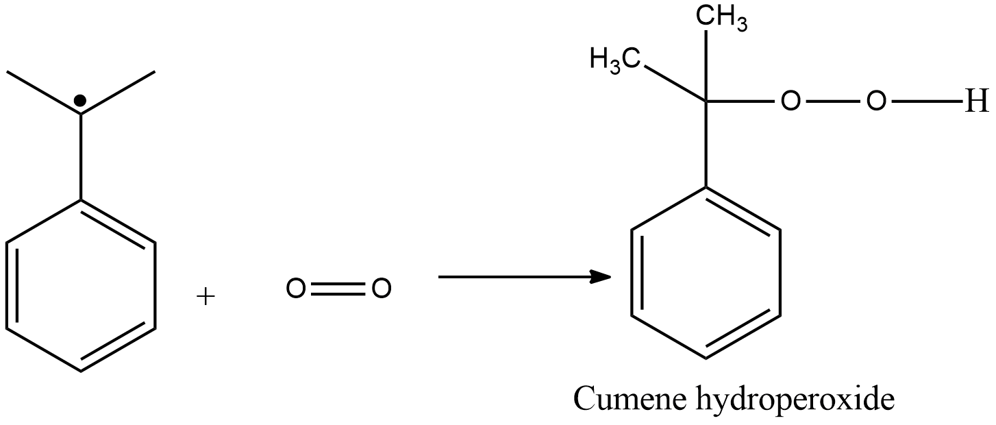 Here R represents the alkyl radical. Now we will see step 2, where this cumene radical reacts with $ {O_2} $ .