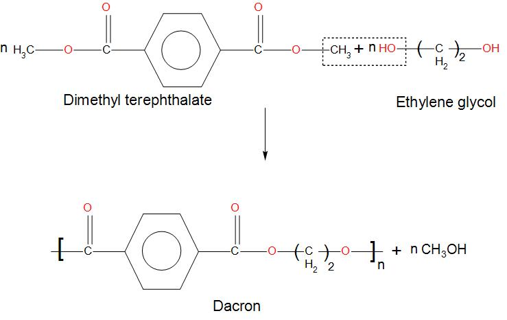 - We can see that Dacron is obtained by the condensation polymerization of Dimethyl terephthalate and ethylene glycol.