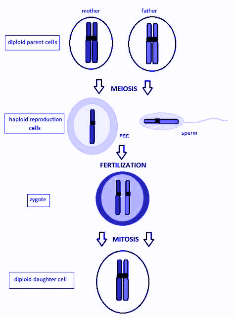 Two haploid gametes combine into one diploid cell to form a zygote, which is the precursor to an embryo offspring, in the process called fertilization. This zygote incorporates the genetic material from both the gametes. It is also known as syngamy.