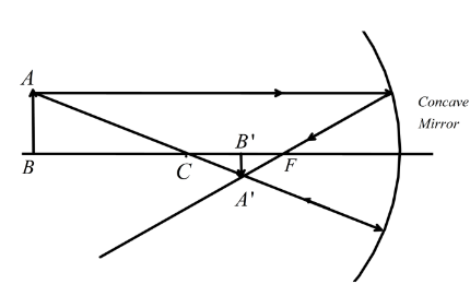 In the diagram we have\[AB\] is the object and \[A'B'\] is the image of the object when it is placed beyond radius of curvature \[C\] and \[F\ is the focus of the mirror. So, from the ray diagram of the object, we can see that the image will be, (i) inverted, (ii) diminished and (iii) real, since it is on the same side as the object in front of the mirror and the object here is real.