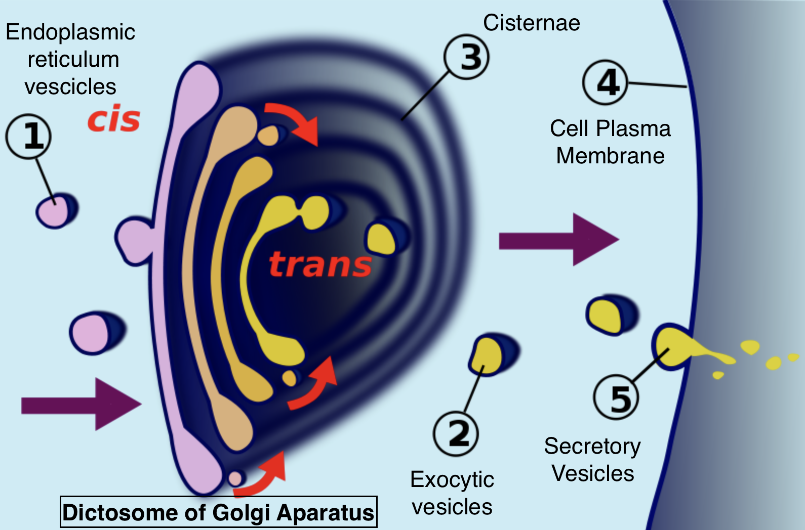 - Cisternae (approximately 1 $\mu m$ in diameter) are closed central, flattened, plate- like, or saucer- like compartments that are held or stacked above each other in parallel bundles. Cisternae are divided by a space of 20 to 30 nanometers in each stack that may contain rod- like elements or fibers. Each cisterna’s margins are gently curved so that the Golgi apparatus’s entire dictyosome takes on a bow- like appearance.