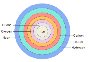 In the stars, when hydrogen present in the star's core is exhausted, the star starts its fusion chain. Hydrogen fuses with helium to form heavier elements, this process goes on and on, first if forms Carbon, then Neon, then Oxygen, then Silicone, at last it forms iron ash as an end product. The figure below shows the cross section of a star.