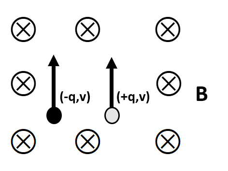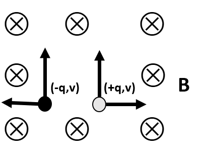 Here, we can see that they have the same velocity, are under the same magnetic field but their charges are equal and opposite.