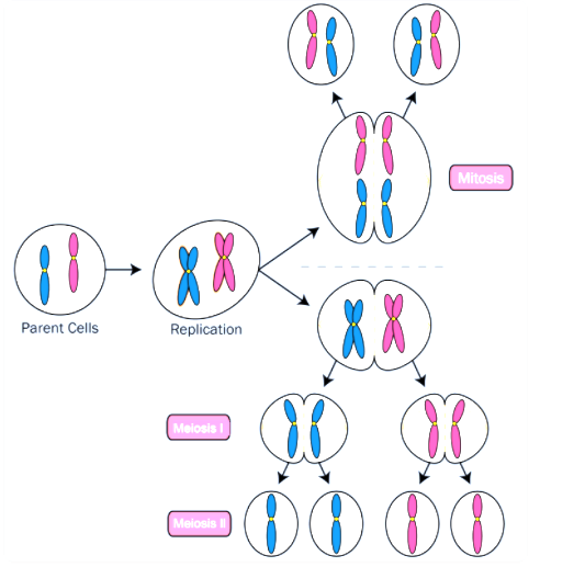 | Mitosis occurs in somatic cells | Meiosis occurs in germ cells |