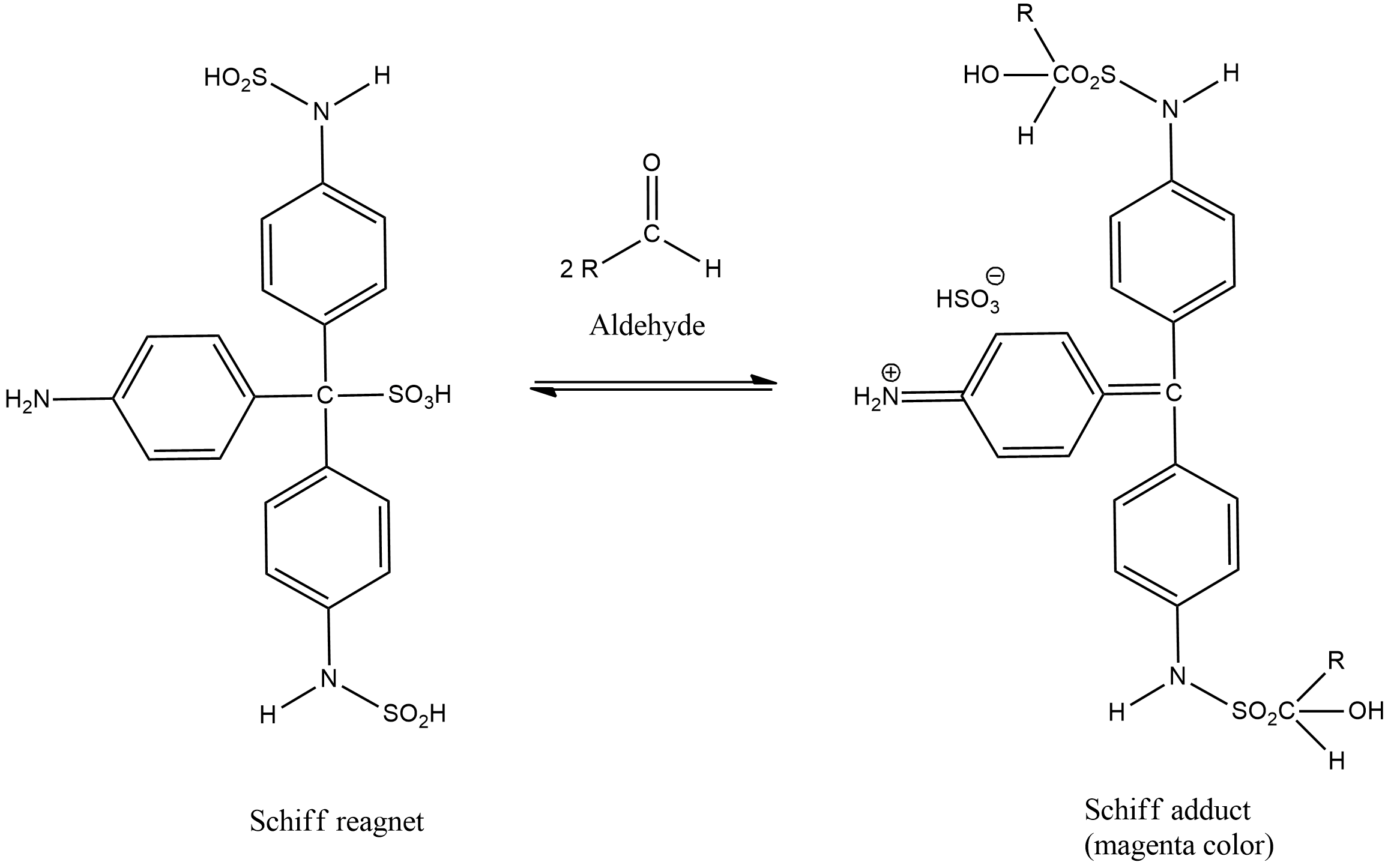 The bisulfite and the pararosaniline react together to form a decolorized adduct. This adduct has a central carbon which is sulfonated. Now the free and uncharged amine groups belong to the aromatic ring that reacts with the aldehyde group to form an aldimine. This aldimine group is a very good electrophile and thus it undergoes further reaction with the bisulfite ion. Finally a bisulfite adduct is formed which is magenta in colour.