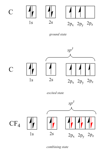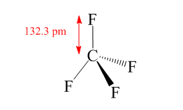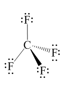 Hence the hybridization of carbon atom in $ C{F_4} $ compound is $ s{p^3} $ so the shape of compound $ C{F_4} $ is tetrahedral with four $ C - F $ bonds pointing towards the corners of a tetrahedron as shown in the following figure: