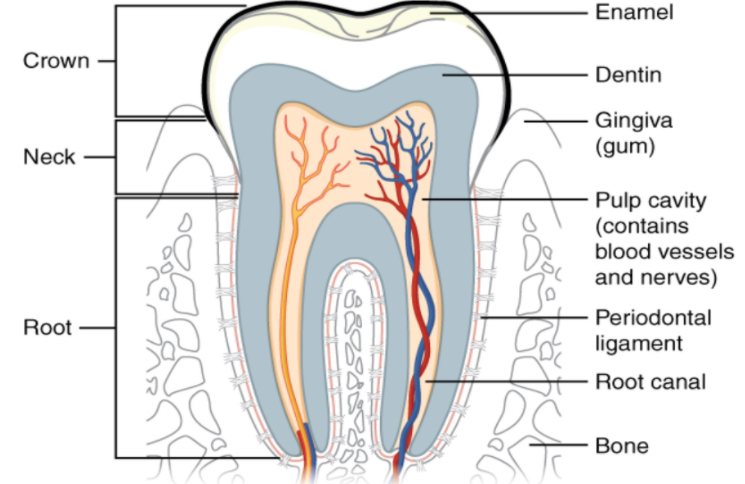 Note:The components in different types of teeth are similar but their proportion may vary. The teeth of males and females differ as the jaw of males is larger than that of females. Also, the amount of dentin is higher in males while in females, the amount of enamel is greater than that present in males.