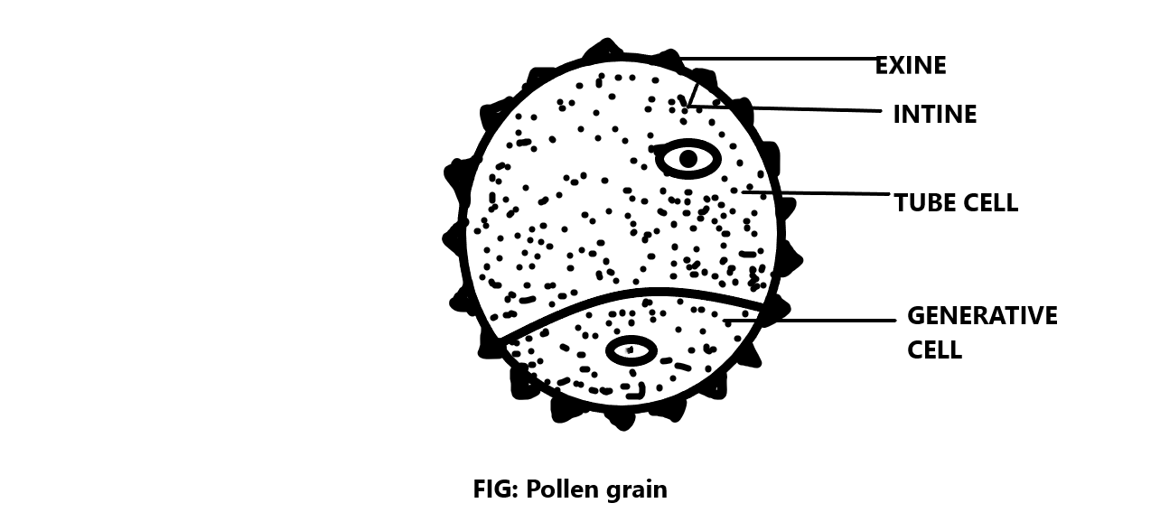 Note:- The pollen grain is a minute body that developed in the male structures of the seed bearing plants. The main purpose of production of pollen grains is the fertilization or pollination. The pollen grains are carried to the female parts of the plant where fertilization occurs. A pollen grain consists of one or more vegetative cells and a single reproductive cell. The outer layer of pollen grain is called exine and is very tough. The internal layer is known as intine which covers the cells.