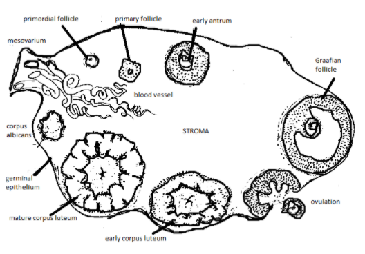 Draw a well-labelled diagram of the cross section of the ovary.