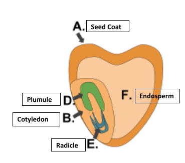 Maize seed: It is a monocotyledonous seed comprising five main parts. The seed has a protective covering known as seed coat. Below the seed coat, embryo and endosperm are present. Endosperm is bulky and consists of reserve food material. The embryo and endosperm are separated by a proteinaceous layer called aleurone layer. The embryo consists of a plumule, radicle and a single cotyledon. The plumule is enclosed in a sheath called coleoptile from which the first leaf germinates during germination. The radicle is enclosed in a sheath called coleorhiza from which forms first roots.