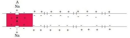When a stimulus is given to this site, the permeability of the membrane at site A is reversed i.e. it becomes freely permeable to ${ Na }^{ + }$ ions. As a result, ${ Na }^{ + }$ ions enter inside the cell rapidly, and hence the concentration of ${ Na }^{ + }$ increases inside the cell which thus makes the membrane positively charged from inside and negatively charged on outside. This is also referred to as depolarization of site A. The potential difference between the membranes at this point is called an action potential. The current flow further since the site immediately next to A had opposite polarity.