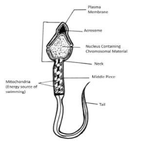(vi) Head part contains nucleus and the head is covered by a cap-like structure called acrosome (it is filled with enzyme, it helps in fertilization of ovum).