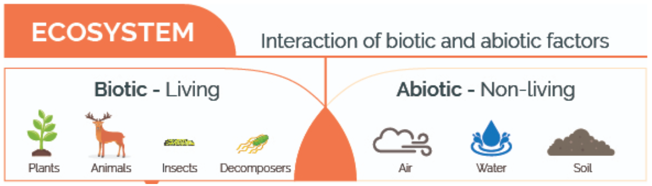 The environment encompasses the interaction between the biotic and the abiotic components. In a natural system the organisms or the biotic components are dependent on the abiotic or non-living components for survival. It is also known as an ecosystem.