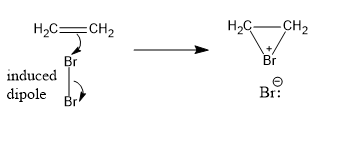 Let’s understand the mechanism of the reaction. In the first step, the attachment of one bromine atom to both carbon atoms. And the bromine atom is positively charged.