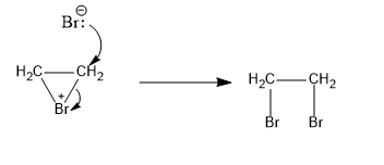 In the second step, the attack of the bromide ion at the bromonium ion from the back side happens. The resultant product is ethylene dibromide. The reaction is: