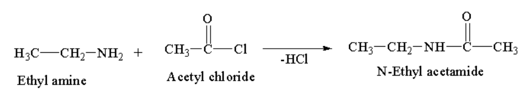 Ethyl amine on acetylation gives N-ethyl acetamide. In the given example reagent is acetyl chloride having Cl as a leaving group. The reaction is shown below: