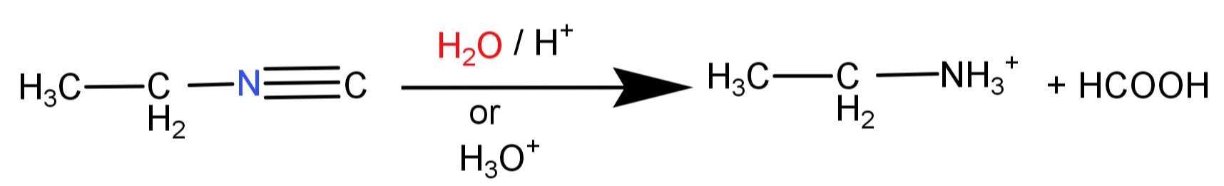 $R - C{H_2} - N \equiv C\xrightarrow{{{H_3}{O^ + }}}R - C{H_2} - NH_3^ + + HCOOH$