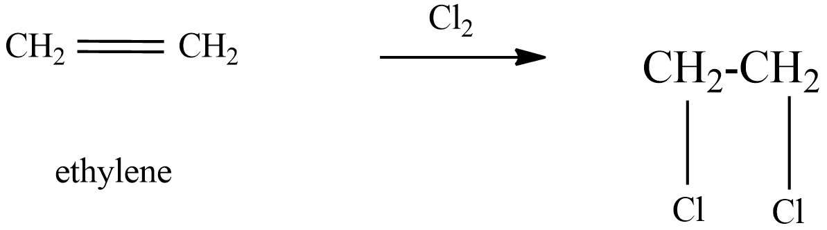 (B) ethylene reacts with dry chlorine gas, which forms ethylene dichloride. The resulting chemical reaction is as follows,