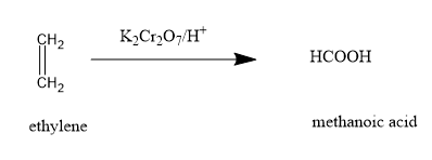 (B)Acidic potassium dichromate is not a strong oxidising agent as alkaline potassium permanganate. Oxidation of alkenes with it gives ketones or carboxylic acids. The reaction with ethylene gives: