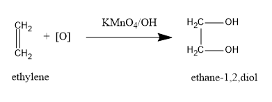 (A)Potassium permanganate in an alkaline medium is a strong oxidising agent. It oxidises the double bond in alkene giving vicinal diols. Ethylene on oxidation with alkaline $ KMn{O_4} $ undergoes hydroxylation reaction and yields ethylene glycol or ethane $ - 1,2 - $ diol. The solution colour changes from pink ( $ KMn{O_4} $ ) to brown ( $ Mn{O_2} $ ).