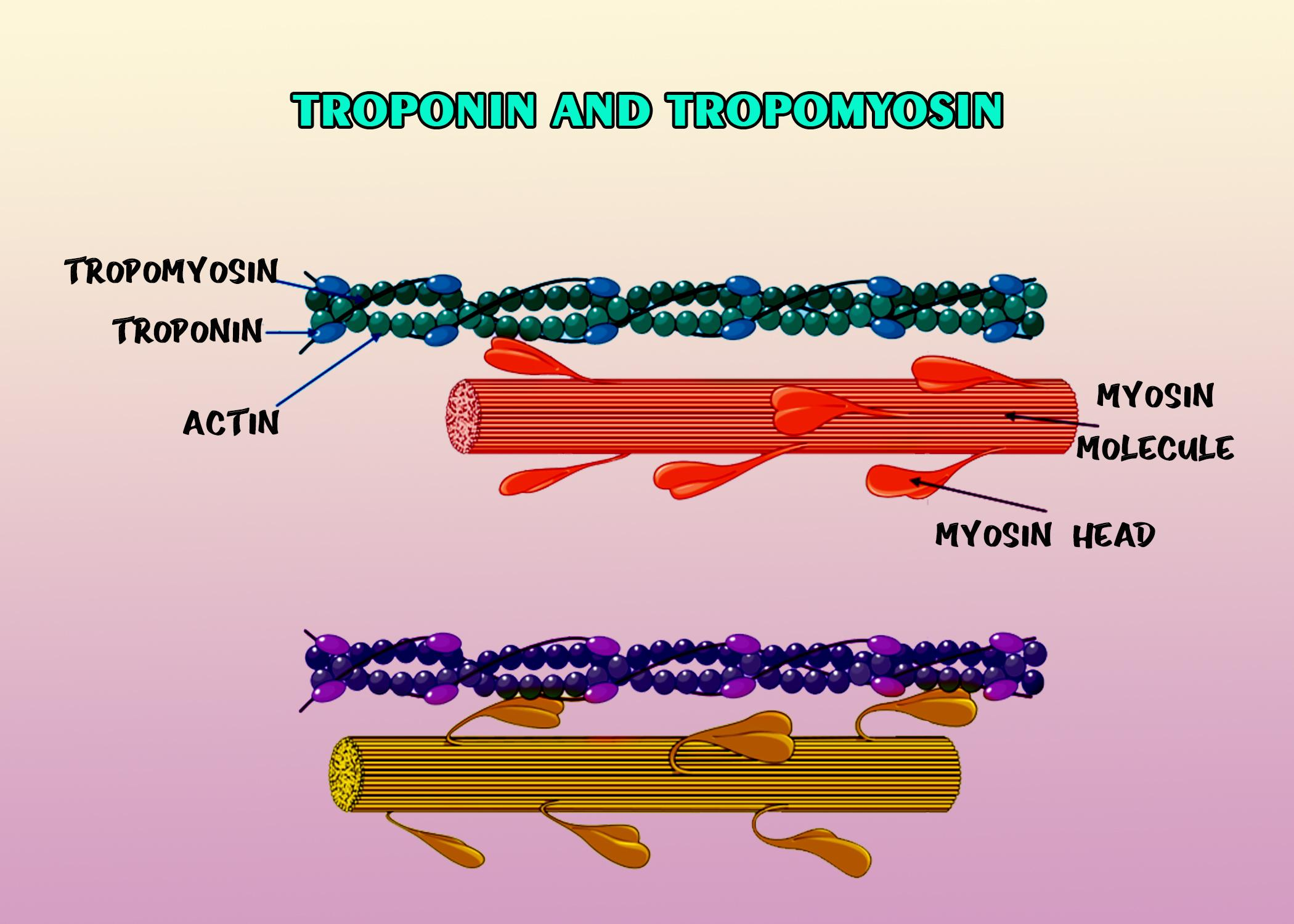 Additional Information: 1)The protein troponin itself has three subunits which play a role in force regulation: TnC(Troponin C) that binds to calcium ions to produce a conformational change in TnI; TnI(Troponin I) which binds to actin in thin myofilaments to hold the actin-tropomyosin complex in place and the last one TnT (Troponin T) binds to tropomyosin, interlocking them to form a troponin-tropomyosin complex.