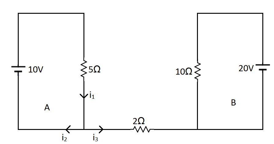 On the first loop that is A, let us consider that the current coming out of the cell of $10V$is ${i_1}$. At the junction, let the current be divided into two parts namely as ${i_2}$ and ${i_3}$. Now for the cell $10V$ in the circuit, the amount of current that is coming out of the positive terminal should be equal to the current that is entering the negative terminal of the battery in turn. So the current ${i_2}$ should have a value equal to ${i_1}$. Now we can write that,