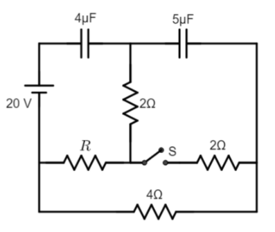We have an open switch in the circuit, and we have a 20V voltage source that is directly connected to a $4\;\mu F$ capacitor. Without the voltage source, the charge stored in the capacitor will be 0. But since we have a voltage source, it becomes responsible for conveying charges to the capacitor, which is called transient current. This transient current continues to flow between the voltage source and the capacitor until the capacitor gets charged to the value of the applied voltage. The capacitor thus acts like a storage device, holding this charge indefinitely as long as the supply voltage is present. When the capacitor reaches the point where it has more or less acquired and stored charge equivalent to dc voltage, it is said to be in a steady state. At this point, there is no potential difference between the voltage source and the capacitor, and no current flows through the capacitor to the circuit and the capacitor acts like an open circuit.