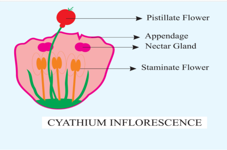 Note: - Though cyathia are said to be one of the types of inflorescence producing false flowers, the flower-like characteristics are underlined by brightly colored nectar glands and often also through the petal-like appendages to the nectar glands.