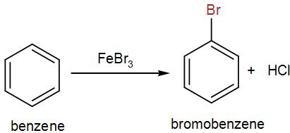 Now firstly, let us discuss the reagents for bromination of benzene. Bromine undergoes electrophilic substitution in presence of a catalyst to give us the brominated product. We use iron bromide here and the product is bromobenzene. We can write the reaction as-
