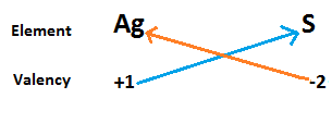 Now we write the symbol of silver and sulphide in a row with their valency below them. Now cross matched the valency of both atoms to calculate the formula of silver sulphide.