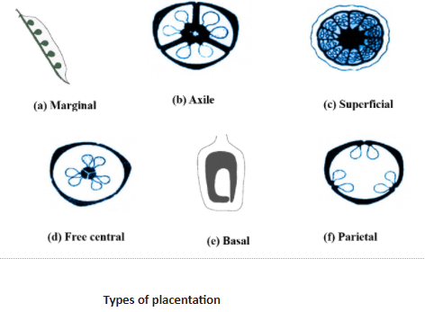 Marginal: It is found in the monocarpellary unilocular ovary, the placenta forms a rigid along ventral side, and ovules are arranged in two vertical rows. E.g.: pea