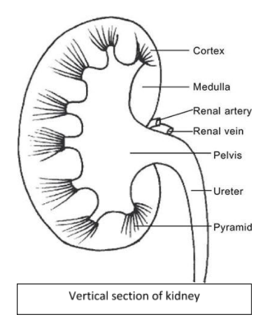 Note: A vertical section of kidney contains: renal cortex, renal medulla and renal pelvis. The outermost region of the kidney is the cortex which contains Malpighian corpuscles of nephrons. The inner region is called medulla. The cone shaped structures that make this part are called the renal pyramids. Collecting ducts open here. The pyramids are connected with the ureter by the renal pelvis.
