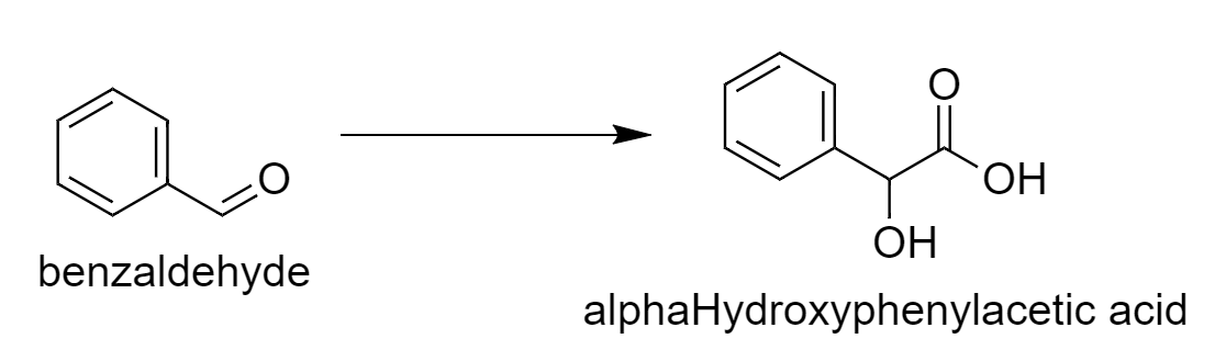 Give conversions: Benzaldehyde to alpha-Hydroxyphenylacetic acid