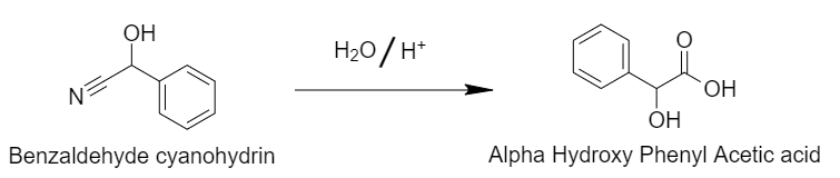 Step 2: Acid hydrolysis of cyanohydrins gives rise to alpha-Hydroxyphenylacetic acid.