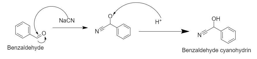 In this reaction, there is a nucleophilic attack of the cyanide group on the carbonyl carbon, which in presence of acid converts into benzaldehyde cyanohydrins.