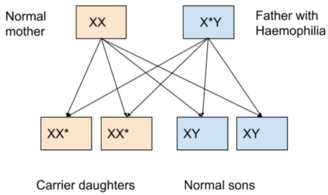 In this scenario, the sons will receive the normal X chromosome from the mother and Y chromosome from the father so they are normal and do not have any recessive gene that causes haemophilia. Whereas the daughters will receive the normal X chromosome from the mother and a recessive X* chromosomes from the father so they will be the carrier of haemophilia.
