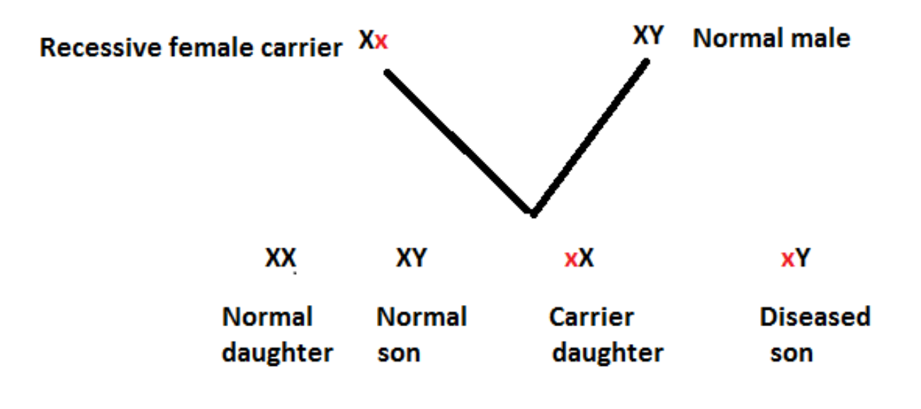 - If a haemophilic carrier mother which means haemophilia is expressed in the recessive gene expressed as Xx where x represents the recessive haemophilia X linked gene is crossed with the normal man whose gene is represented as XY. The offsprings would be as follows-