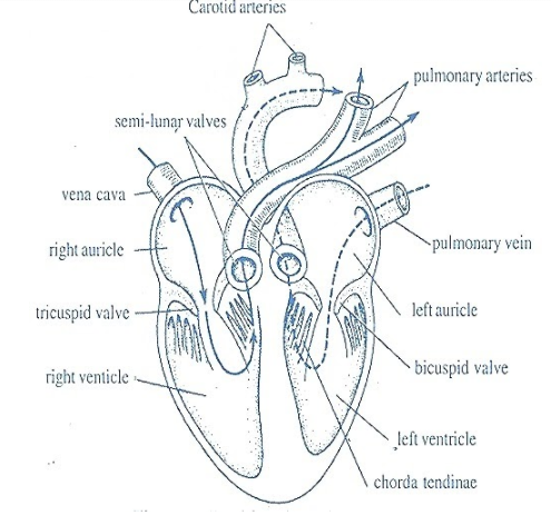 The heart of the rabbit is four-chambered. There are two atria (auricles) and two ventricles. The ventricular chambers are larger than the auricles. The auricles are thin-walled compared to the ventricles. The right auricle and left auricle are separated by the interauricular septum. The aperture in the right ventricle is known as sinus-auricular aperture. This aperture is guarded by valves. The pulmonary vein opens in the left auricle through an oblique aperture. The two auricles are separated from the ventricles by auriculo-ventricular septum. The right and left auricle open into the ventricle through the auriculo-ventricular aperture. The auriculo-ventricular aperture is guarded by an auricular ventricular valve. This valve has four flaps. Chordae tendinae are thread-like chords which are attached to the muscular wall of the ventricle at their other ends.