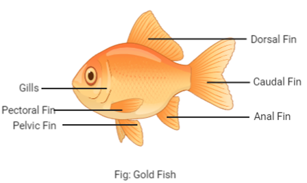 Note: The fish use back fins. It is called the Caudal fin. It helps them to move through the water. The body of fish resembles the shape of a boat. The body tapers down at both ends, head and tail are comparatively smaller than the mid part of the body, hence we say their body is streamlined. This shape allows water to glide over them thus enabling swift and efficient movement. Fishes have a skeleton that is covered with muscles.