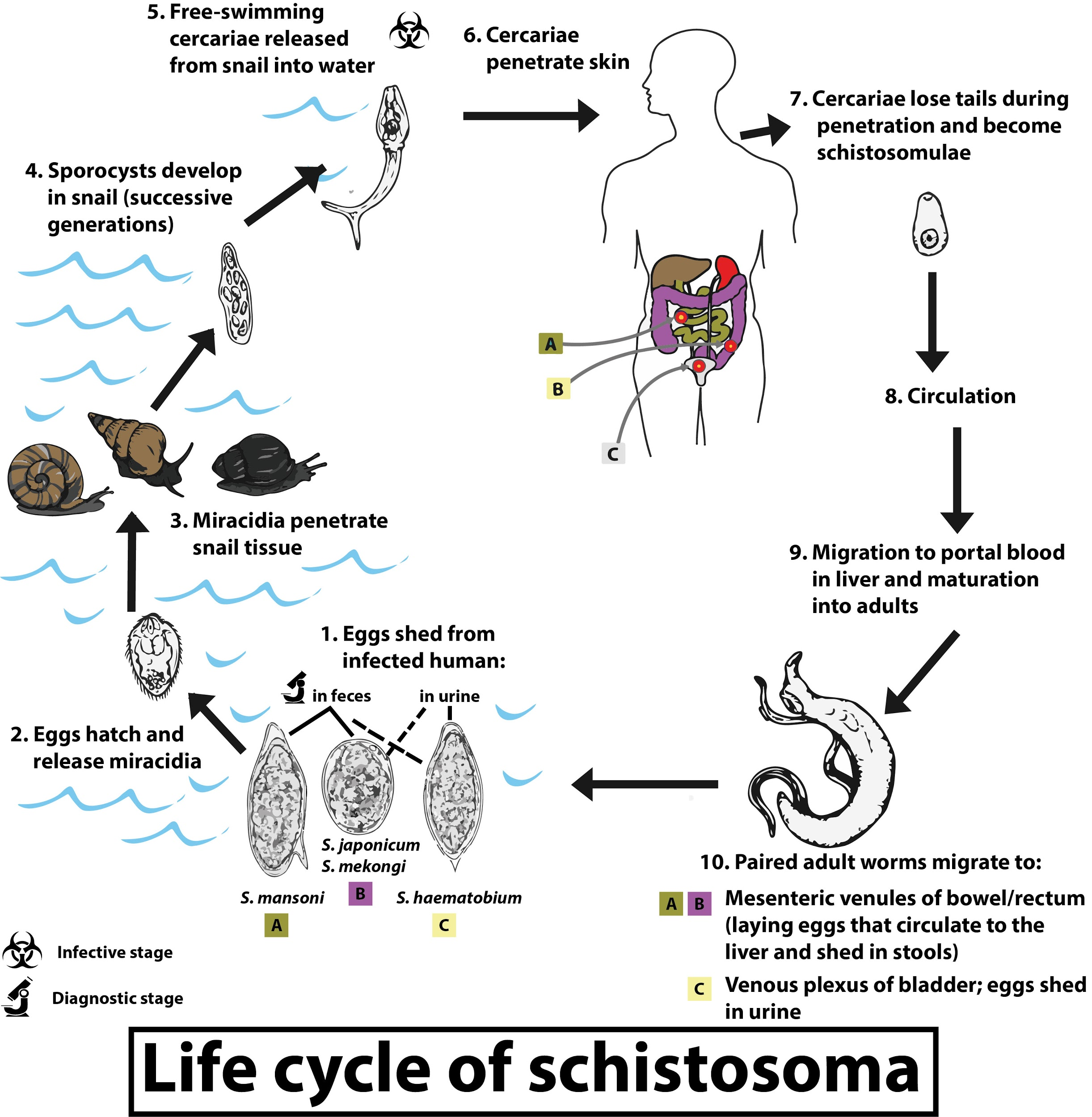 Hint: Human infection of blood fluke occurs through a larva that is formed by multiplication of sporocysts in their life cycle. Hundreds of these larvae are shed by snails to continue their life cycle. They enter human skin and shed their forked tail.