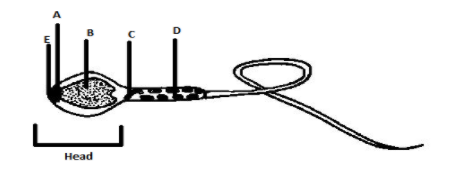Identify the labelled parts A-E the given figure of sperm.
